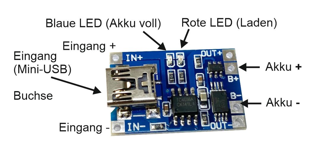 Lademodul mit Schutzbeschaltung für Lithium-Akku, Mini-USB