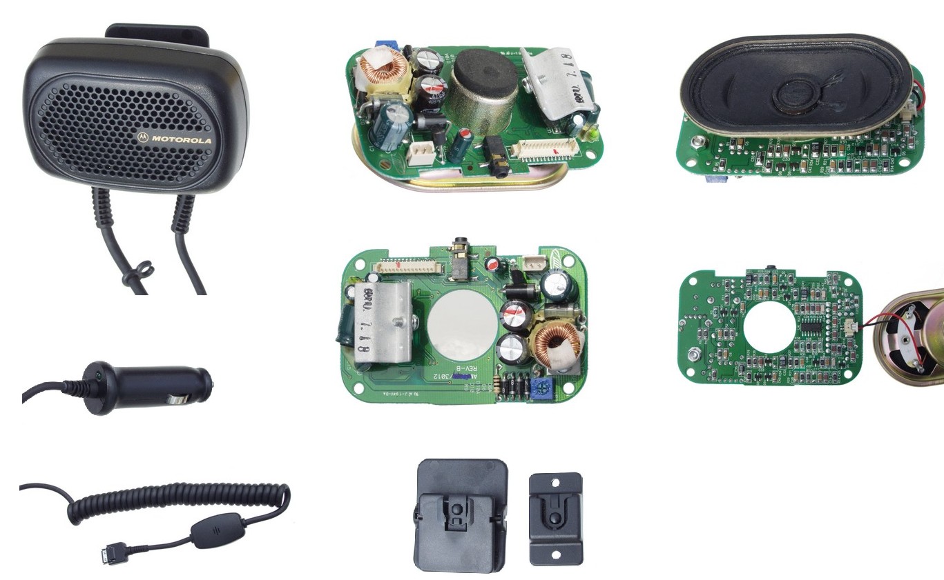 Lautsprecherbox Motorola mit Verstärker für Handyanschluß mit ca. 1,5m langem Spiralkabel (durch Abschneiden des Steckers universell einsetzbar), DC Anschlußkabel 45 cm lang, KFZ-Stecker mit grüner LED (Betriebsanzeige). Type der Freisprecheinrichtung TDMA M3097/M3090.