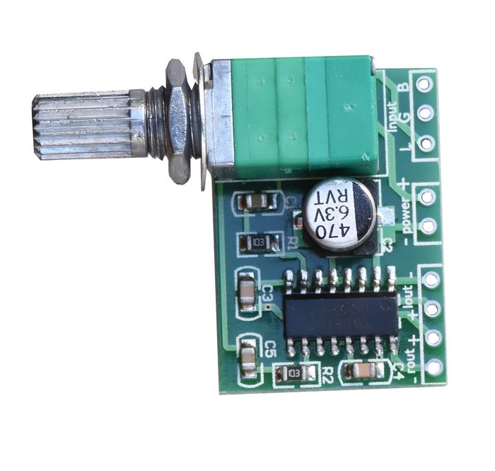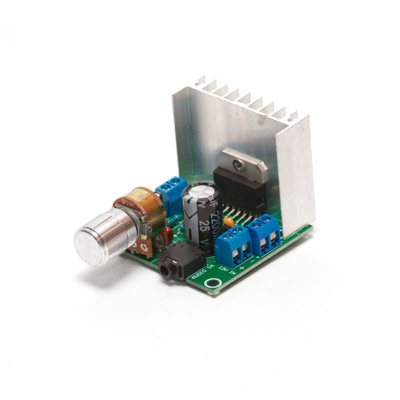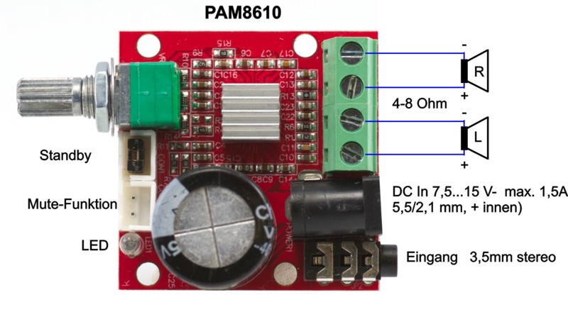 Stereo Verstärkermodul 2x10 W PAM8610 mit sehr geringen Abmessungen (63x40x20 mm). Betrieb an 7,5-15V, einfacher Anschluss über Hohlbuchse 5,5/2,1 mm. NF-Eingang über 3,5 mm stereo Klinkenbuchse. Lautsprecheranschlüsse über Schraubklemmen, passend für 4 oder 8 Ohm Lautsprecher.