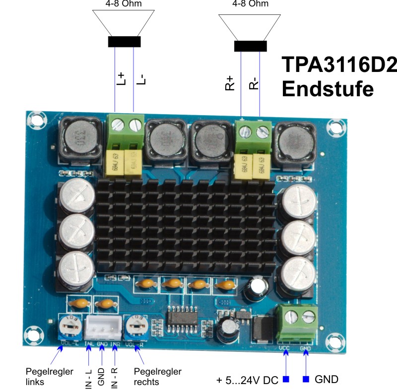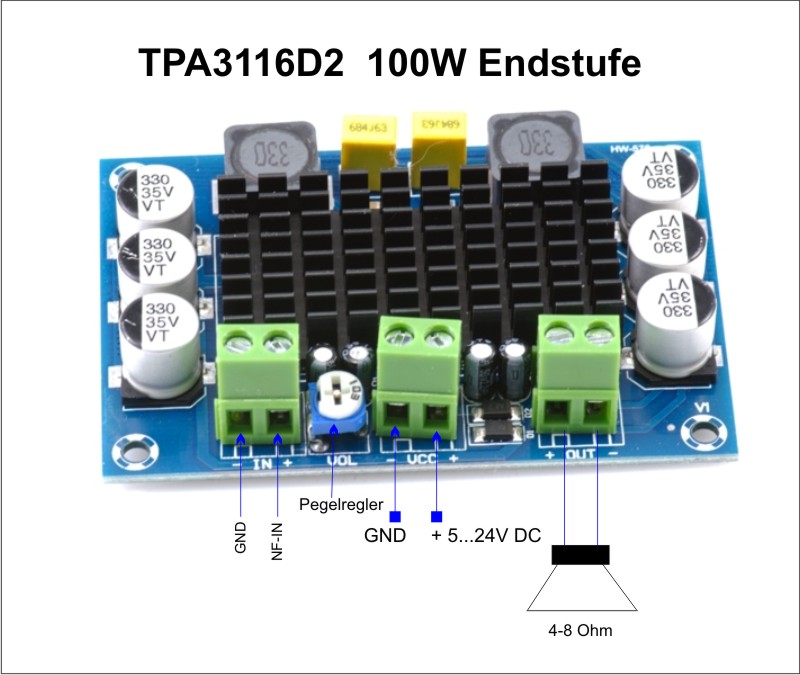 Stereo Verstärkermodul mit 2x50 W Ausgangsleistung mit dem IC TPA3116D2.