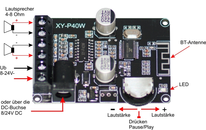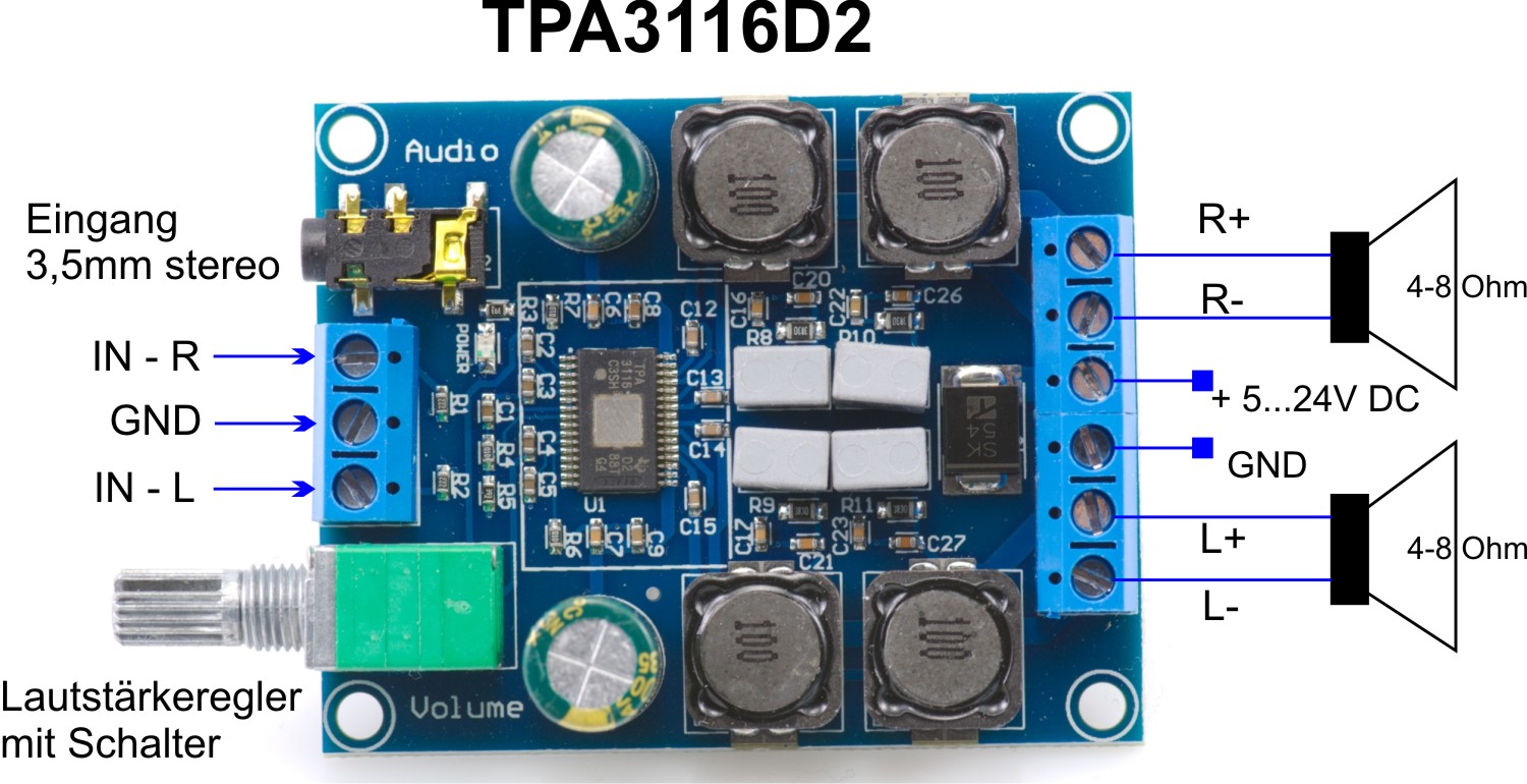Betrieb an 4,5V.....24V DC (Schraubklemme)Einfacher Anschluss, NF-Eingang über 3,5 mm stereo Klinkenbuchse oder Schraubklemme.Lautsprecheranschlüsse über Schraubklemmen, passend für 4 oder 8 Ohm Lautsprecher.Status LED, und stereo Lautstärkeregler mit Schalter.Technische Daten