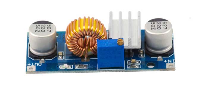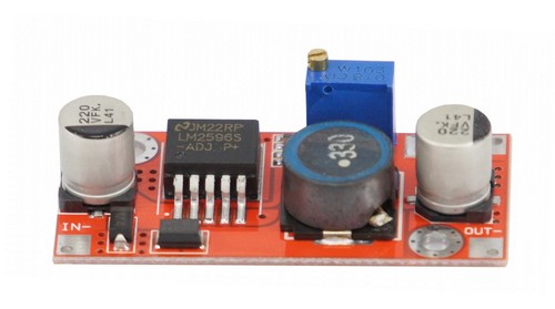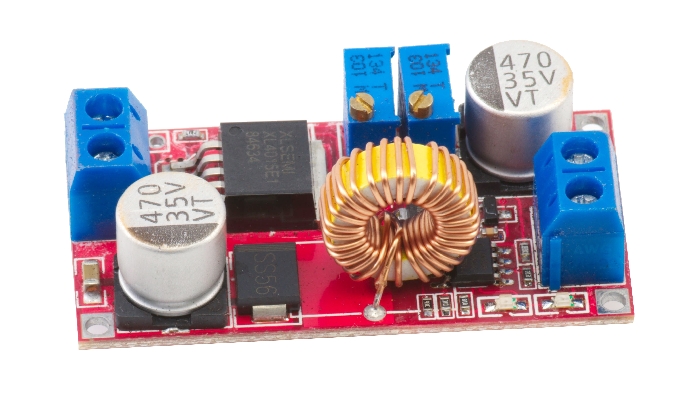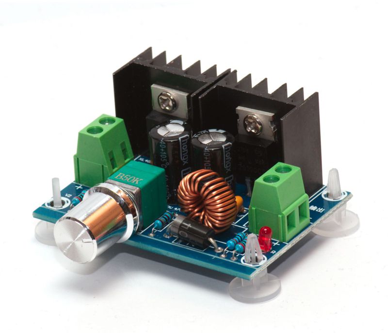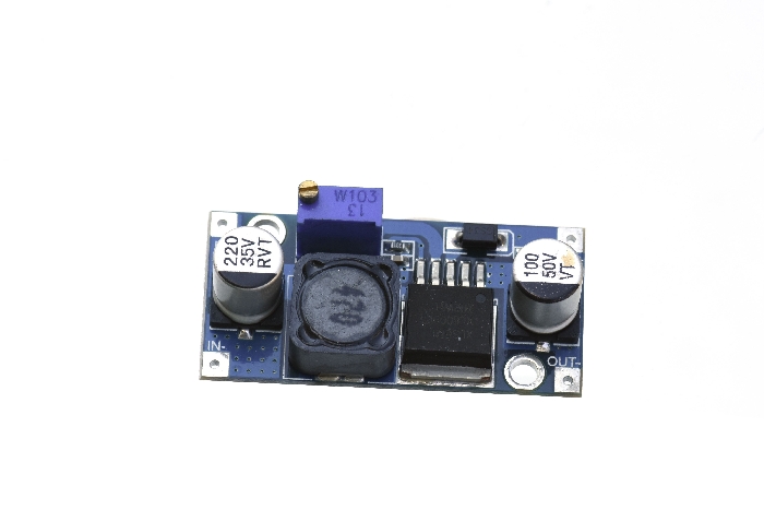 Eingangsspannung: 4 ... 40V / 200W Ausgangsspannung: 1,26 ... 36V Ausgangsstrom: 5A mit Kühlung 8A Die Ausgangsspannung ist über das Potentiometer mit Ein-/Ausschalter einstellbar. Das Netzteil arbeitet im Step-Down Modus. Abmessungen (LxBxH): 61x43x33 mm