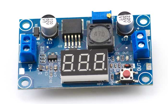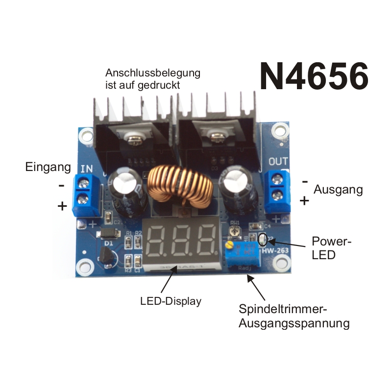 Ausgang einstellbar 1,4 - 30VDie Spannungseinstellung erfolgt über den Spindeltrimmer.Schaltregler ist XL4015Mit den Tastern kann das Display ein-/ausgeschaltet und die Ein-/Ausgangsspannung angezeigt werden.Anschluss über Schraubklemmen oder Lötpad auf der Platine.Auf ausreichende Kühlung ist zu achten!Modulabmessungen ca. 37x61x16 mmLieferung mit Befestigungsmaterial (Abstandsbolzen) und Kühlkörper.