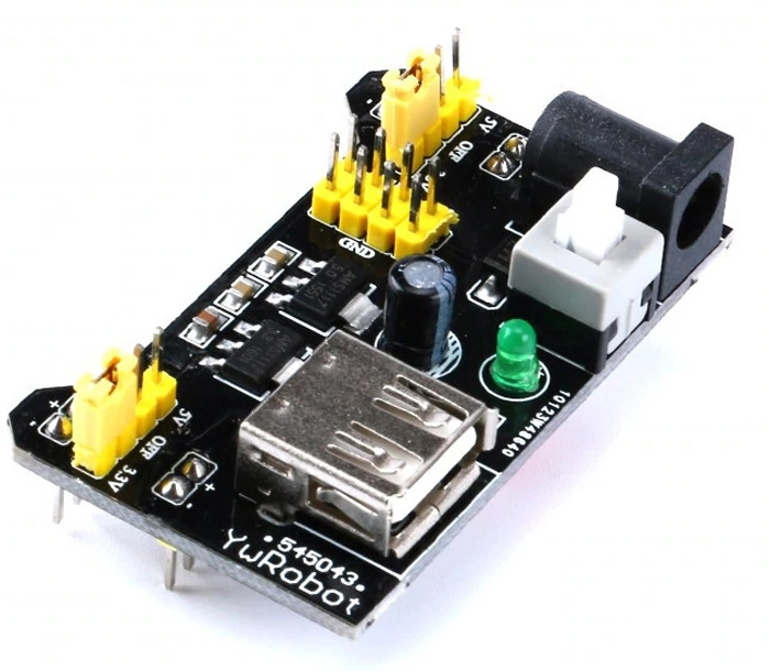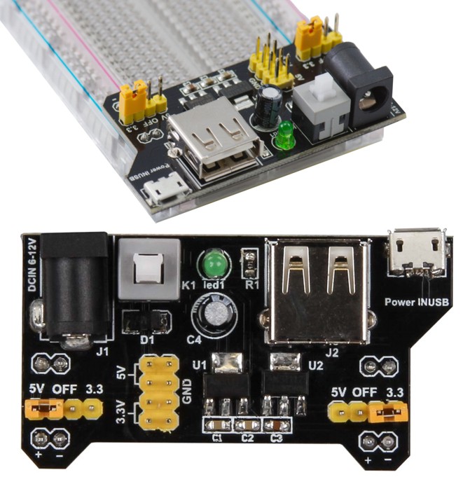 Das Modul erlaubt Ihnen die einfache Spannungsversorgung Ihrer eigenen Experimente oder Versuchsaufbauten auf Breadboards.