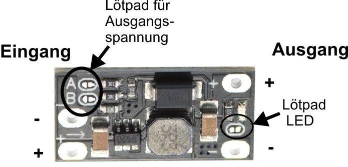 Die Ausgangspannung wird über die beiden Lötpad A/B eingestellt.