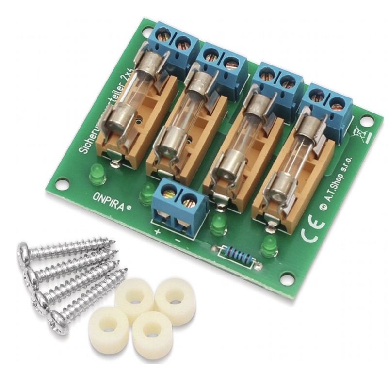 Stromverteiler Platine 4-fach mit einer Sicherung für jeden Ausgang. Die Polarität der Anschlüsse wird über LED angezeigt. Die Kontrollleuchten zeigen an, wo am Verteiler der + Pol angeschlossen wurde. Wird der Verteiler mit Wechselstrom betrieben leuchten beide LED. Mit im Lieferumfang sind 4 Sicherungen mit 3A,.Selbstverständlich müssen diese nicht zwangsläufig verwendet werden und können durch Sicherungen mit einer niedrigeren Amperezahl ausgetauscht werden.