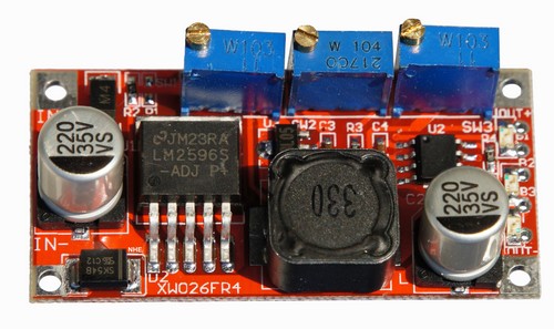 DC-DC Stepdown Fertigmodul mit dem bekannten Schaltregler LM2596.Eingangsspannung 4,5....35V-Ausgangsspannung einstellbar über Spindeltrimmer zwischen 1,25...30V-Maximaler Strom von 2-3A ist nur mit Kühlung (Kühlkörper) möglich.Ab einer Ausgangsleistung >14W sollte ein Kühlkörper verwendet werden.Der Schaltregler arbeitet mit einer Schaltfrequenz von 150KHz.Ein-/ Ausgang ist nicht galvanisch getrennt.Abmessungen ca. 23,5x49x14mm.