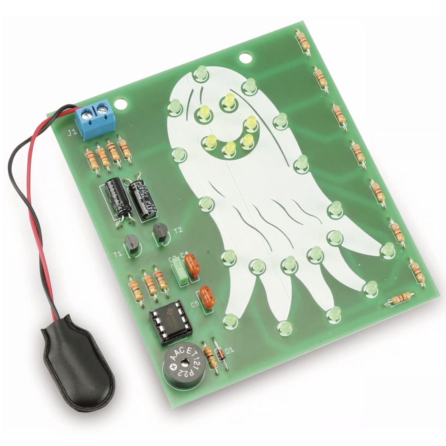 Dieser Bausatz ist als Übungsbausatz gedacht. Er dient als Dekorationselement z.B. zum Aufhängen in Fensternischen. Die Umrisse und das Gesicht des Geists bestehen aus LED's, wobei die Augen blinken und alle anderen statisch leuchten. Bei "geschlossenen" Augen wird ein Piepston ausgegeben.