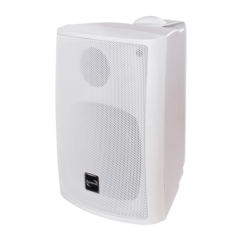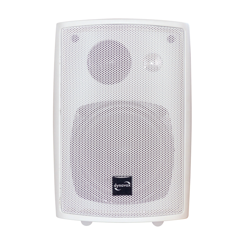 Dynavox HiFi Box mit Wandhalterung. Witterungsbeständige 3-Wege Boxen in schlagfestem Kunststoffgehäuse. Auch im überdachten Außenbereich verwendbar. Kompakte Bauweise und Befestigungsbügel aus Metall für die Montage an der Wand oder Decke. Bestückt mit Polypropylene beschichteten 100 mm Tiefton-, 50 mm Mittel- und 20 mm Hochton-Chassis, Klippfix-Anschlüsse. Aufhänge-Vorrichtung am Lautsprecher, sowie Montagebügel (verstellbar).