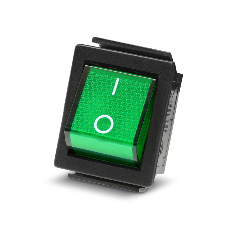 Wippenschalter beleuchtet und I/0 beschriftet, 2-polig EIN/AUS.
