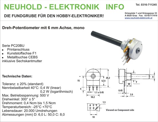 - Nennbelastbarkeit 40°C: 0,4 W (linear), 0,2 W (logarithmisch)