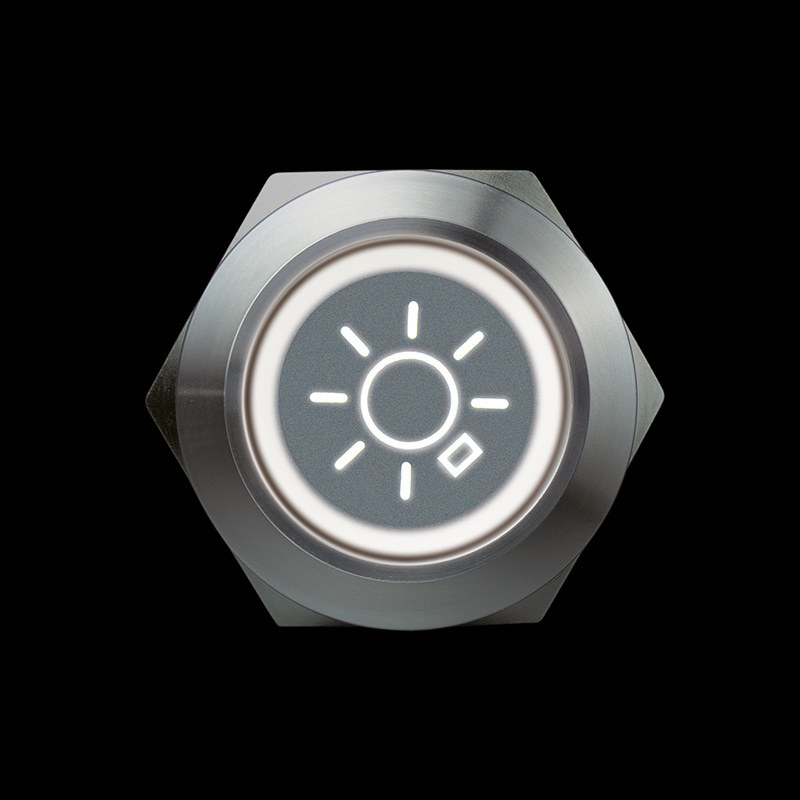 Vollmetalltaster Edelstahl mit Lichtsysmbol. Ring und Symbol beleuchtet. Bei Spannungen größer 50 V (AC) geeignete Erdung erforderlich, wenn die Trägerplatte nicht metallisch oder nicht geerdet ist oder bei der Verwendung von Plastikmuttern!