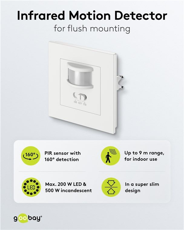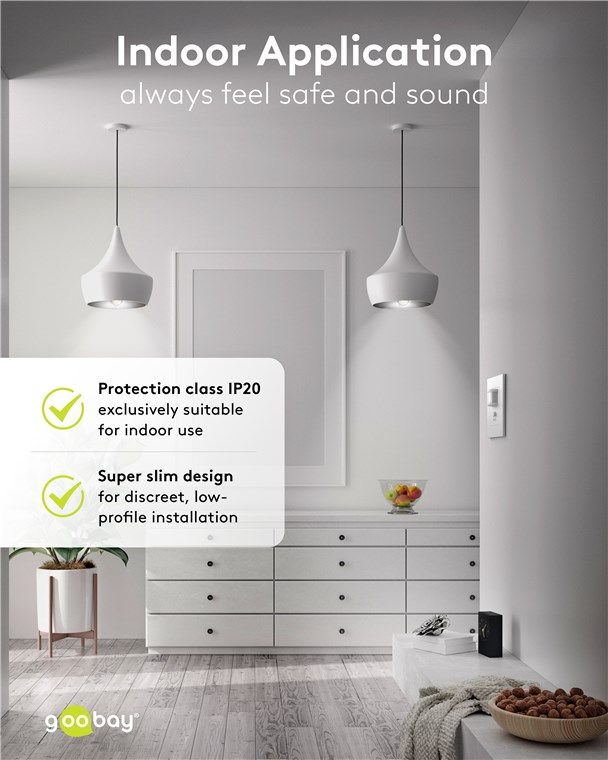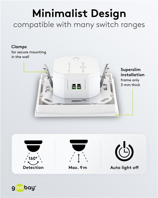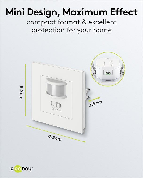 Perfekt in dein Wohndesign integriert: Der Bewegungsmelder wird superflach in einer Wanddose angebracht und passt mit seinem schlichten, quadratischen Design passt zu vielen gängigen Schalterprogrammen. Über den Frontschalter schaltest du den Sensor bei Bedarf ganz komfortabel ein und aus.