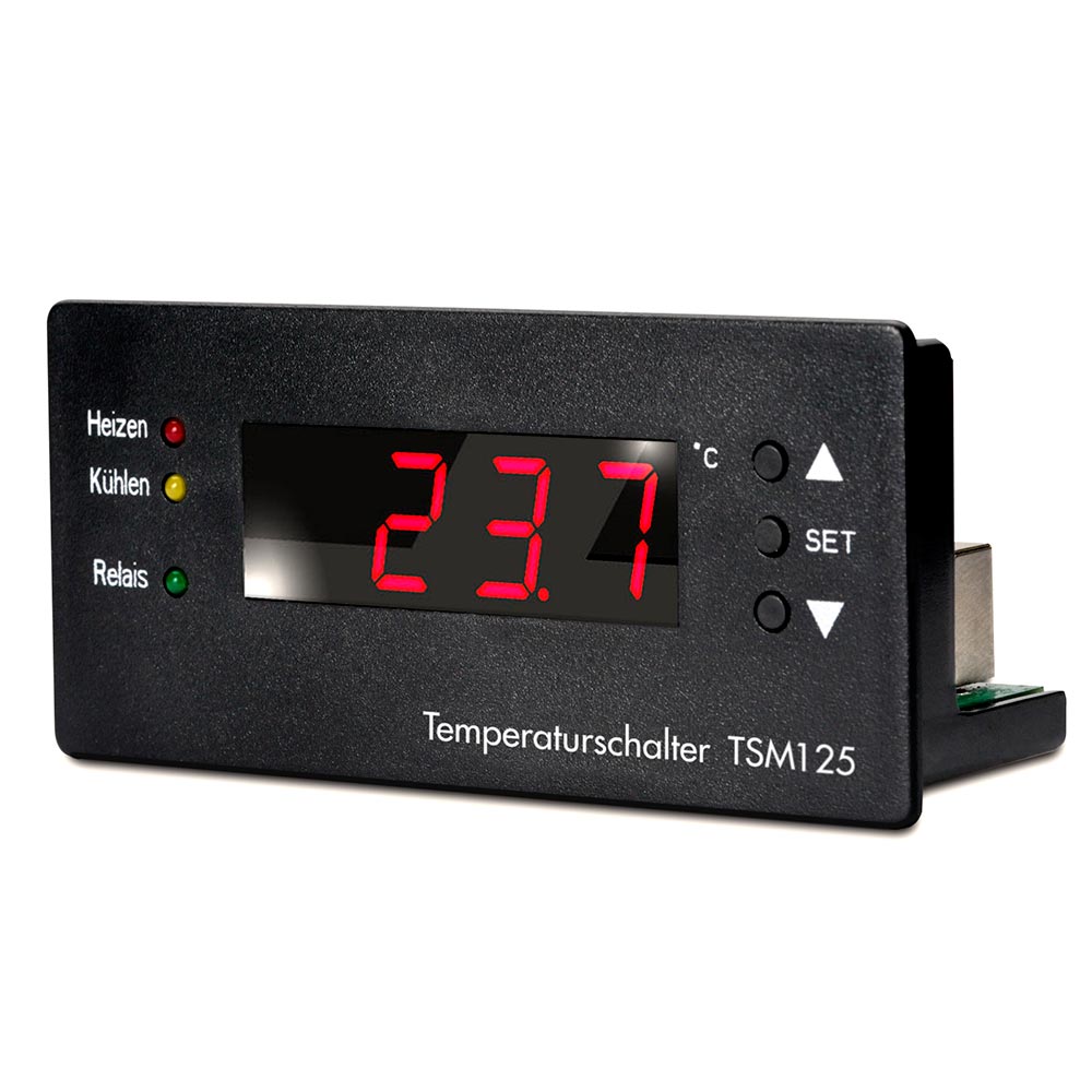 Das neue Temperaturschalter-Einbaumodul TSM 125 eignet sich hervorragend für alle Einsatzbereiche, bei denen eine Temperaturregelung im Heiz- oder Kühlbetrieb erforderlich ist. Sein externer, steckbarer Temperatursensor erfasst Messbereiche von -55 bis +125° Grad Celsius. Die Schalttemperatur wird in 0,1 Grad-Schritten eingestellt. Eine 12,7mm große 7-Segment-Anzeige zeigt die Ein- und Ausschaltemperatur bzw. auch die aktuelle Temperatur an. Eine rote LED signalisiert zudem „Heizen“, eine gelbe „Kühlen“, eine weitere leuchtet bei eingeschaltetem Relais. Das Elektronik-Thermostat ist nicht nur übersichtlich und einfach in der Handhabung, sondern auch sicher in der Anwendung. Fühlerkurzschluss und Fühlerunterbrechung werden sofort erkannt. Das Gerät kann eigenständig eingesetzt werden, aber auch als Ersatz für defekte mechanische Thermostate oder für Digitalthermometer dienen.