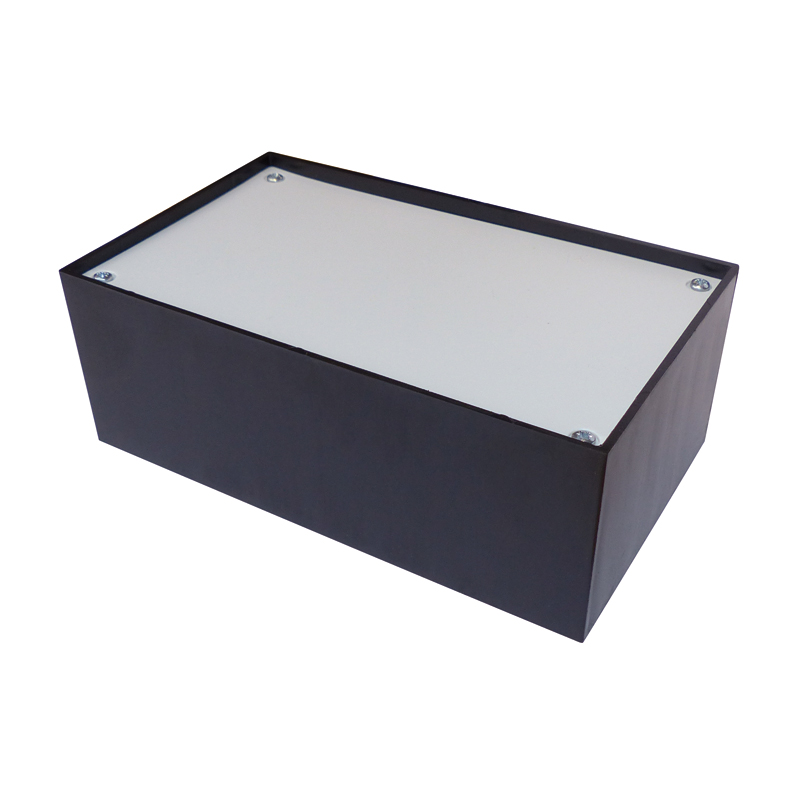 Das Gehäuse hat auf der Innenwand Nuten zur Aufnahme von Printplatten. Der Deckel ist aus Kunststoff und lässt sich gut bearbeiten. Gehäusefarbe schwarz, Frontplatte silbergrau.