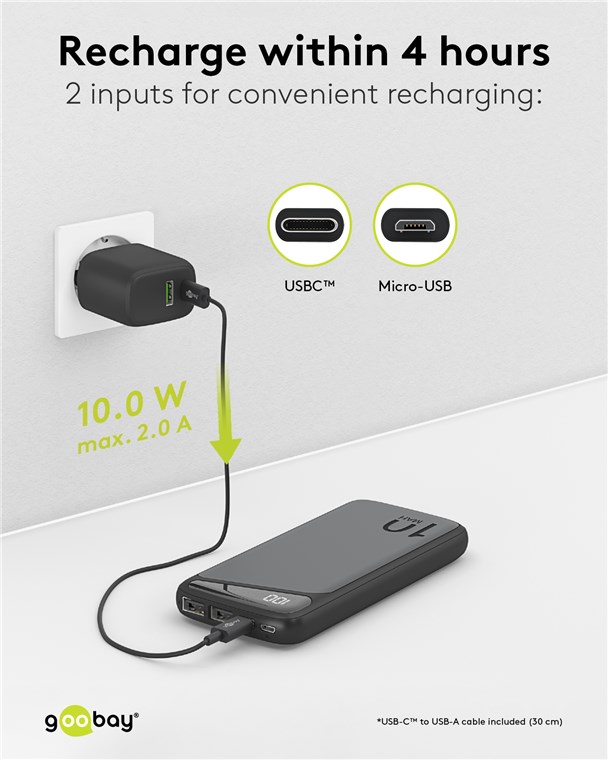 - Das Aufladen der Powerbank erfolgt über USB-C™ oder einen herkömmlichen Micro-USB-Anschluss.