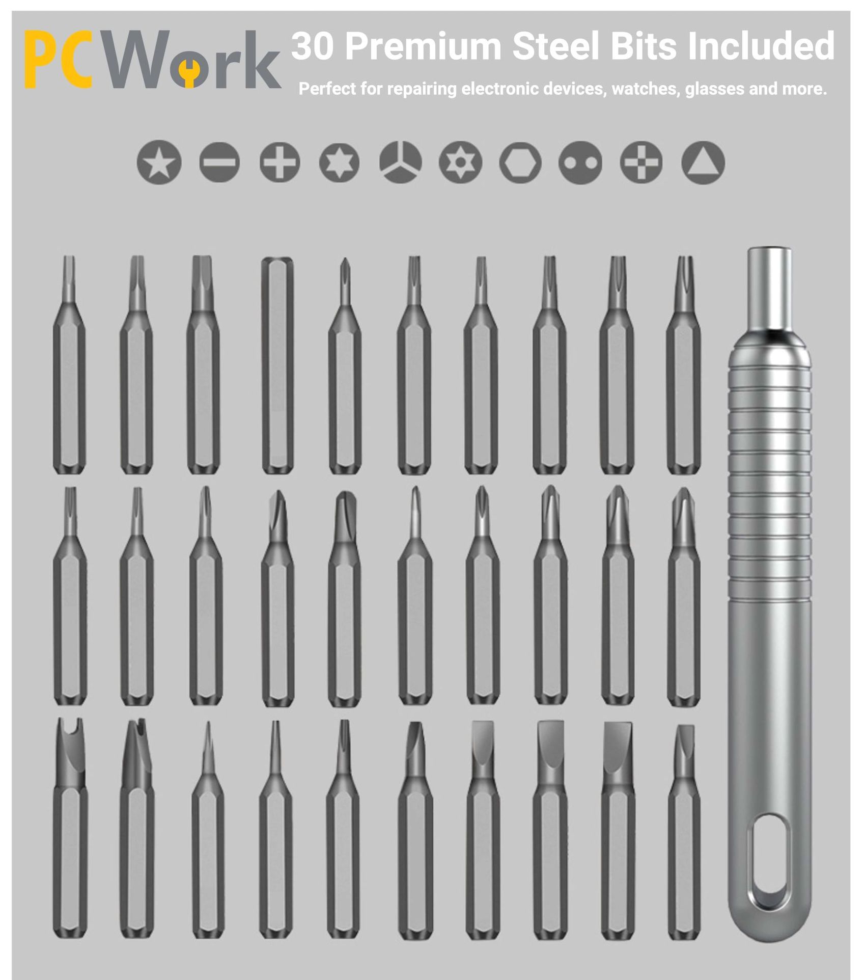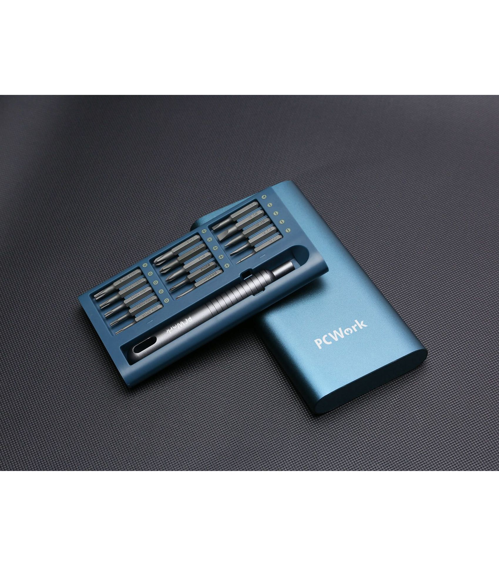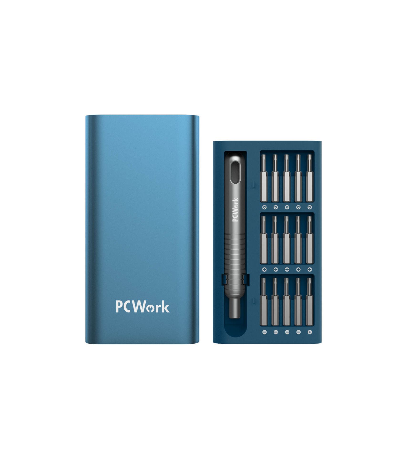 Das PCW08A 30in1 Präzisionsschraubendreher-Set enthält 30 verschiedene Bits aus hochwertigem S2-Stahl, die für hochpräzise Reparaturen an Smartphones, Tablets, Brillen, Uhren und anderen Geräten mit kleinen Schrauben verwendet werden können. Ein besonderes Merkmal des Sets ist der ergonomische Aluminiumgriff, der einen ausgezeichneten Halt bietet und über einen integrierten Magneten verfügt, der die Bits fest an ihrem Platz hält und so Präzisionsarbeit ermöglicht. Wenn die Bits nicht in Gebrauch sind, hält der in den Koffer integrierte Magnet sie fest und verhindert, dass sie herausfallen. Das Etui ist wunderschön gestaltet und hat ein mattblaues Finish, das die hochwertige Optik und Haptik des Bitsets unterstreicht. Aufgrund der hochwertigen Materialien und des attraktiven Designs ist der PCW08A ein perfektes Geschenk für jeden Heimwerker oder professionellen Anwender und ein Muss für jeden Haushalt.