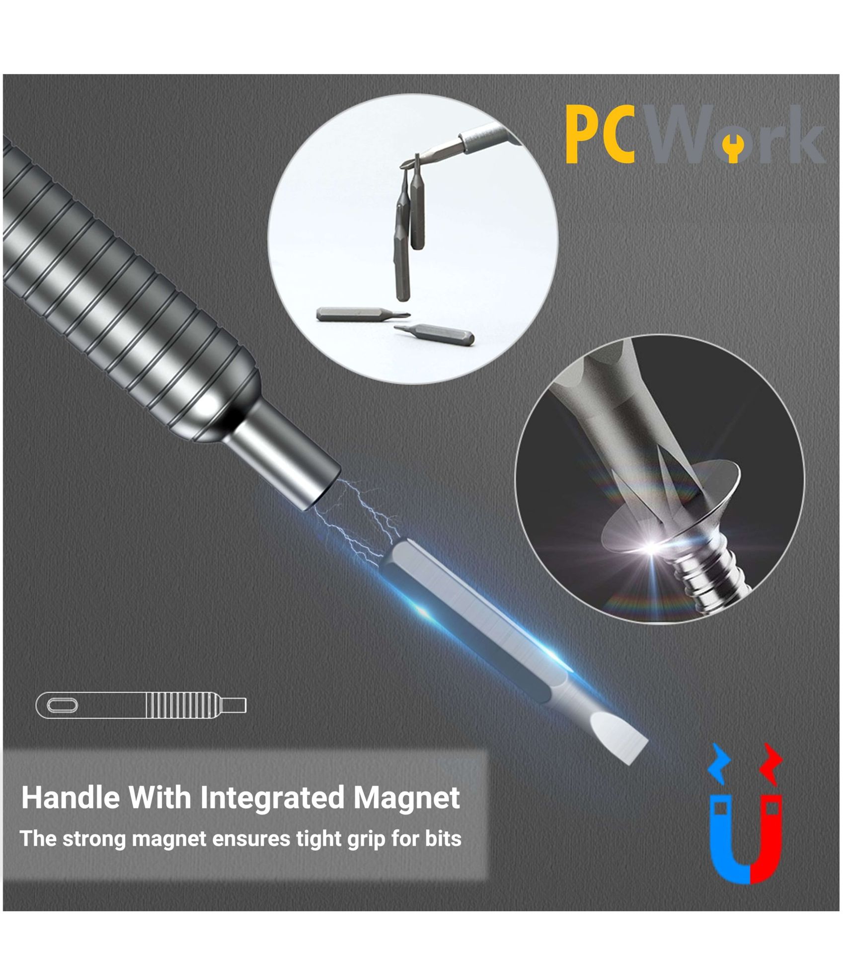 - Die Bits werden durch den im Griff integrierten starken Magneten fest an ihrem Platz gehalten