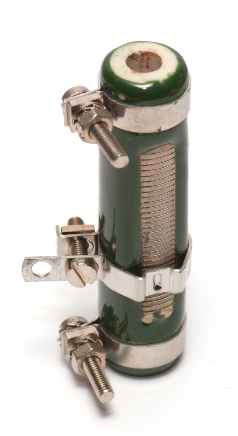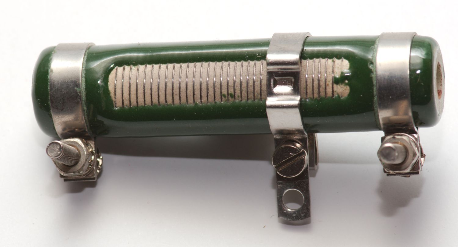 Leistungswiderstand mit einstellbarer Abgreifschelle und Lötösen.