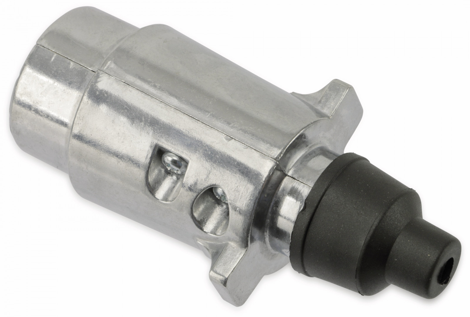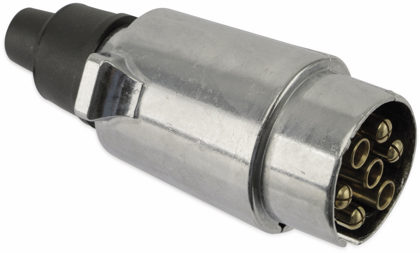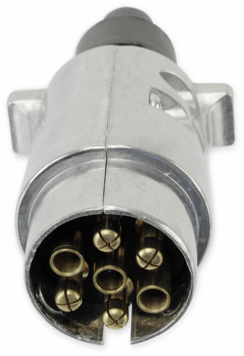 Hochwertiger Stecker aus stabilem Aluminiumdruckguss mit Zugentlastung und wasserdichter Kabeleinführung, zum Anschluss eines PKW-Anhängers, Wohnwagens oder Bauwagens am KFZ mit 7-poliger Steckdose.