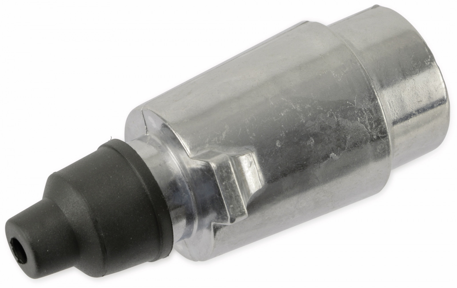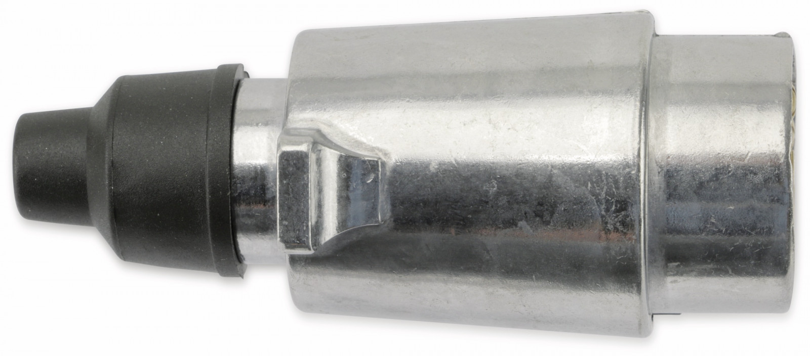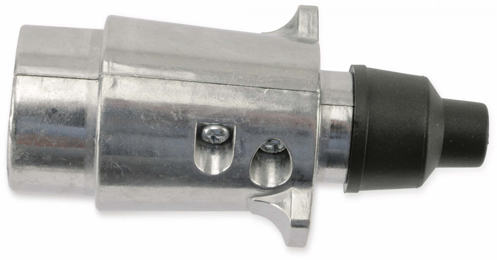 Hochwertiger Stecker aus stabilem Aluminiumdruckguss mit Zugentlastung und wasserdichter Kabeleinführung, zum Anschluss eines PKW-Anhängers, Wohnwagens oder Bauwagens am KFZ mit 7-poliger Steckdose.