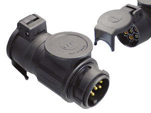 Steckdosen-Adapter zum Anschluss von KFZ-Anhängern mit 7-poligem Stecker (alte Norm) an Fahrzeuge mit 13-poliger Anhänger-Steckdose (neue Norm).