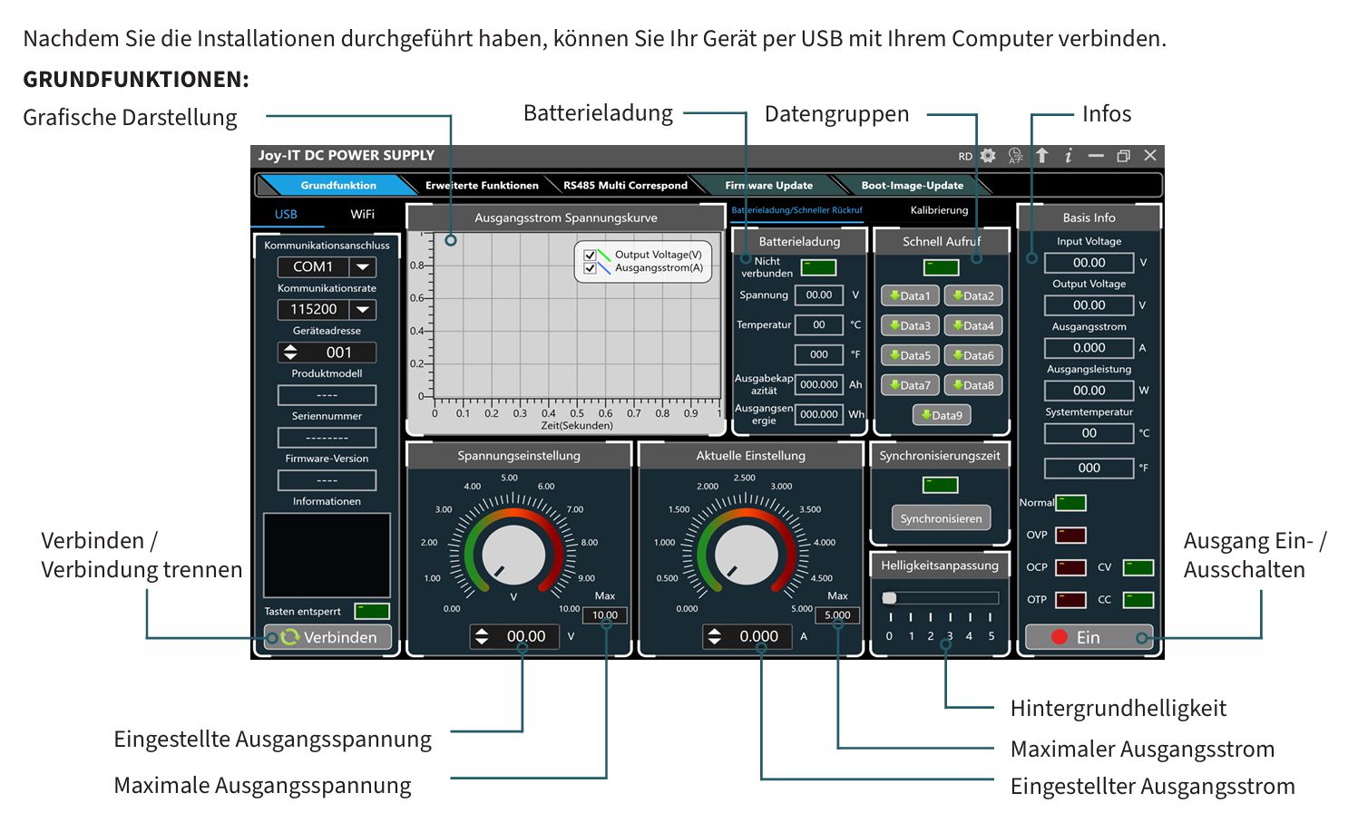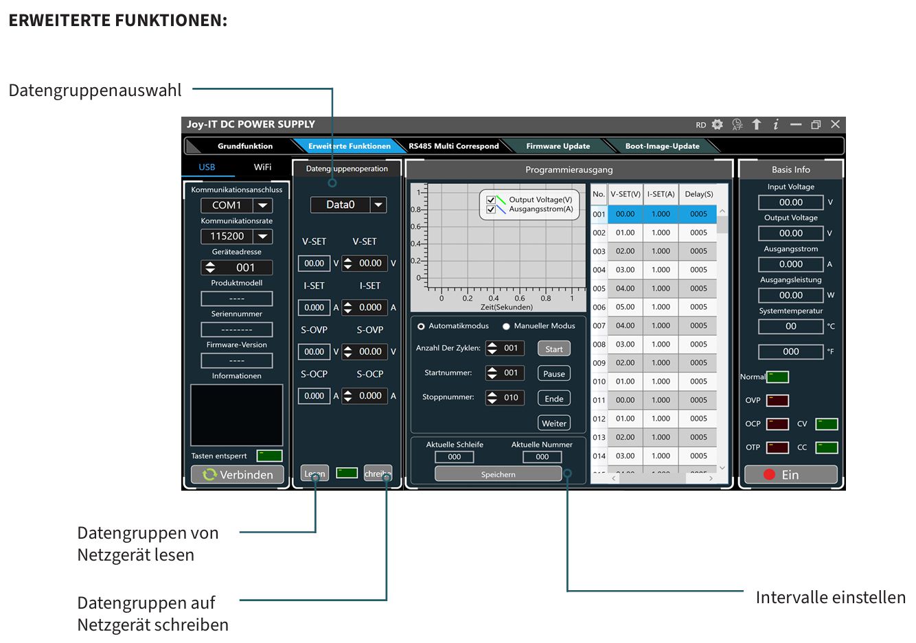 Es können mit Hilfe des intuitiven Bedienfeldes bis zu 9 verschiedene Gleichstromspannungen programmiert, gespeichert und abgerufen werden, sogar individuelle Einstellung diverser Schutz- und Limitierungsfunktionen (z.B. Überspannungsschutz) sind programmierbar.