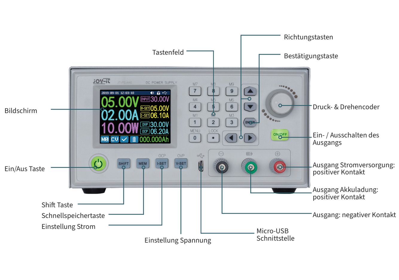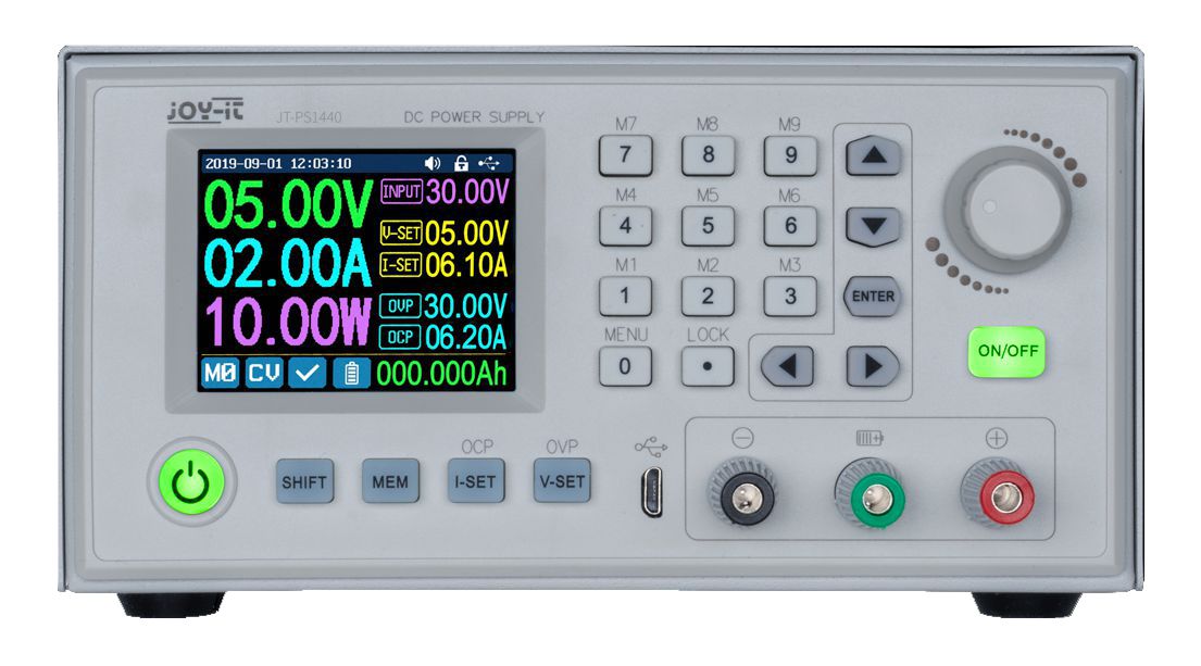 Mit unserem PS1440-C erhalten Sie ein programmierbares Labornetzteil, welches Ihnen Gleichstromspannungen zwischen 0,01 bis 60 Volt und Gleichstromstärken zwischen 0,01 bis 24 Ampere am Spannungsausgang bereitstellt.