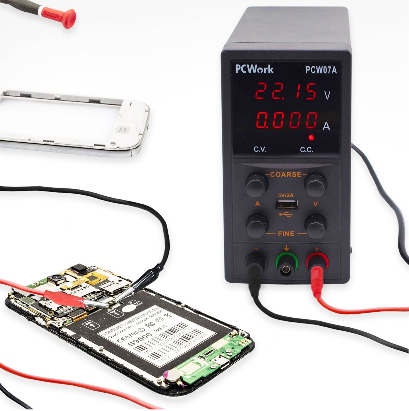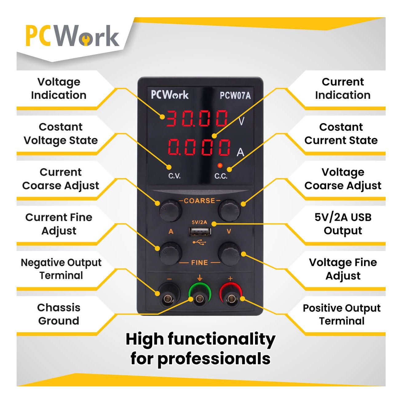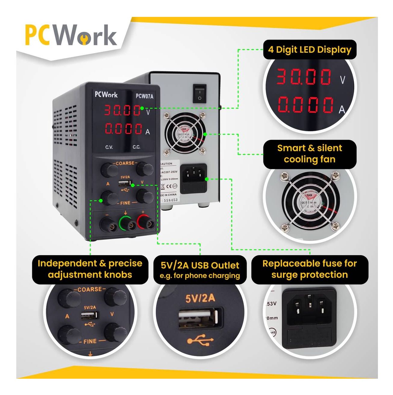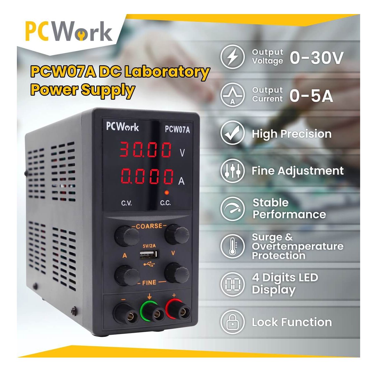 Das PCW07A Labor-Netzteil ist perfekt für jeden, vom ambitionierten Heimwerker bis zum professionellen Elektroniklabor. Mit einer Ausgangsspannung von 0-30V und einem Ausgangsstrom von 0-5A bietet dieses Netzteil eine hochpräzise, gleichmäßige und stabile Leistung. Darüber hinaus sorgt die digitale Kalibrierungs- und Sperrfunktion dafür, dass Ihre Einstellungen immer genau sind, während der Überspannungsschutz hilft, Unfälle zu vermeiden und der 5V/2A USB-Ladeanschluss es ermöglicht, mobile Geräte wie Smartphones oder Tablets zu laden. Die 4-stellige LED-Anzeige zeigt den Ausgangsstrom und Ausgangsspannung an, die sich mit den Drehschaltern leicht einstellen lassen. Und schließlich ist das hochwertige, kompakte Design mit mattschwarzer Oberfläche nicht nur ästhetisch ansprechend, sondern auch äußerst robust, was dieses Netzteil zu einer guten Wahl für jeden Arbeitsplatz macht.