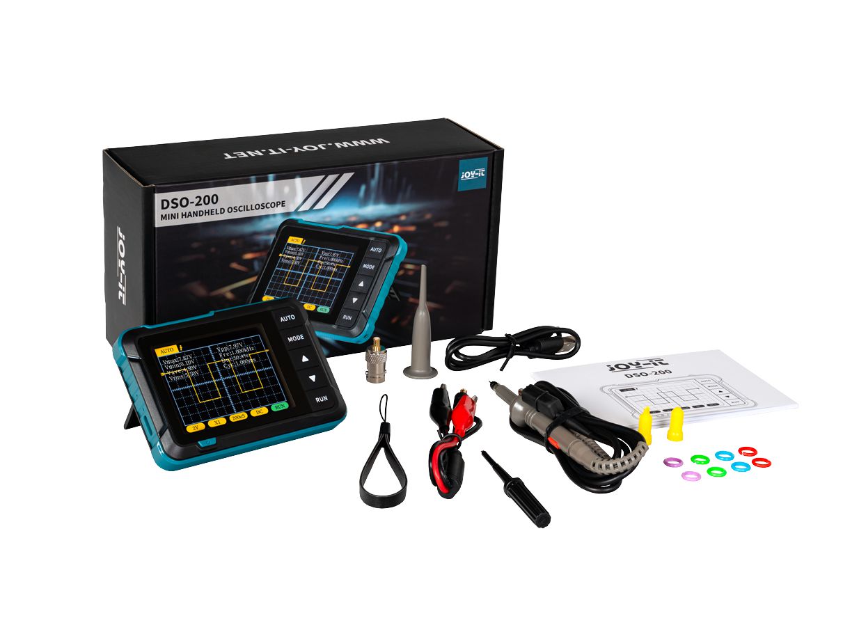 - Lieferumfang: DSO-200, USB-C Kabel, Handschlaufe, Oszilloskop-Tastkopf, Prüfklemmen, BNC-Adapter, Anleitung