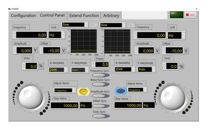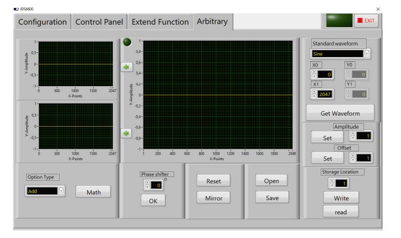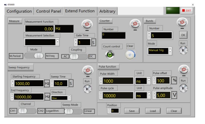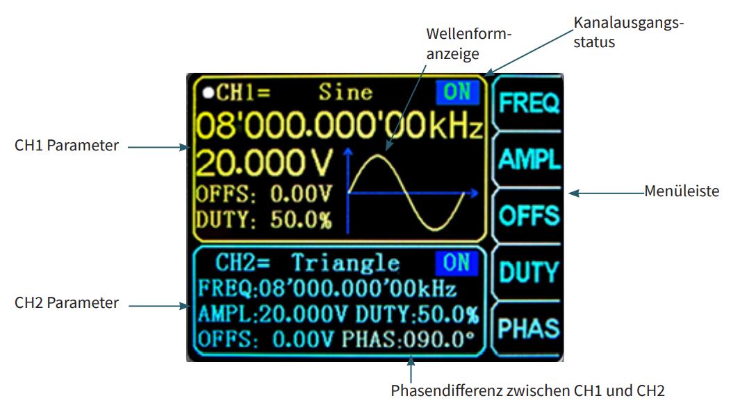 - Signalformen: Sinus, Rechteck, Dreieck, Welle, Halbwelle, Exponentieller Anstieg.