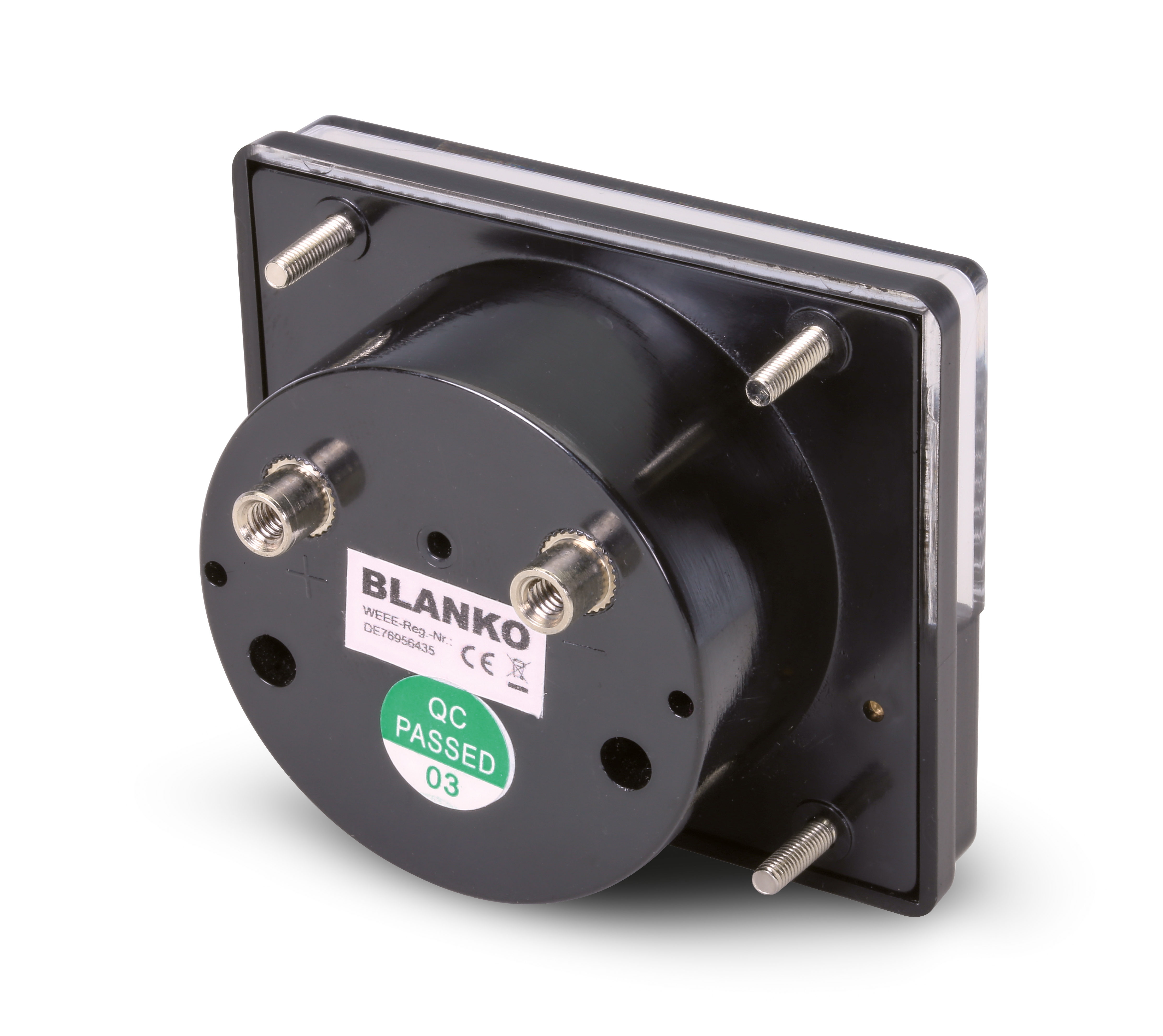 Drehspul-Einbauinstrument, moderne rechteckige Form, Abdeckung industriegrau, schwarzes Gehäuse, Skala weiss, Nullpunkt-Korrektur, Befestigung mit 4 eingepressten Gewindebolzen, Messer-Zeiger, senkrechte Gebrauchtlage, keine Fremdfeld-Beeinflussung durch Kern-Magnet.