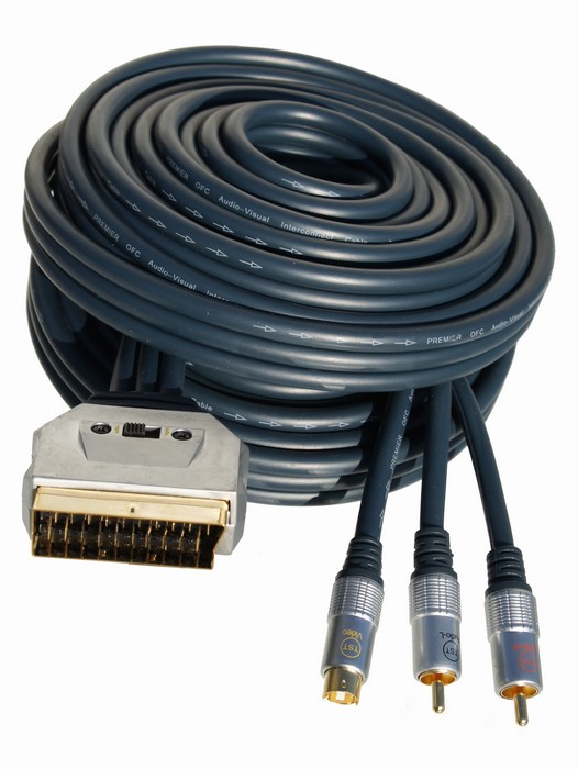 Hochwertiges High Quality Scart-/ Cinchkabel mit geschraubtem Scartstecker im Metallic-Design. Scartstecker auf 6 x Cinchstecker, Kontakte vergoldet. Länge 1,5 m