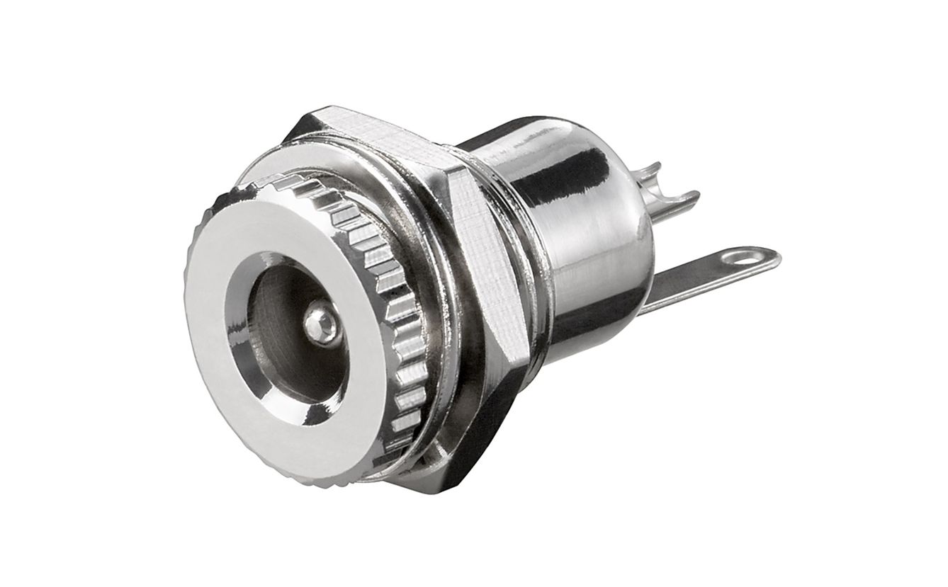 DC-Einbaubuchse Stift 2,1 mm, geschlossene Bauart mit Lötanschluss. Zum Konfektionieren eines Kabels von individueller Länge oder zum Ersetzen einer defekten Einbau-Hohlbuchse 3-polige DC-Buchse findet Verwendung im AV-Bereich, bei elektronischen Haushaltsgeräten und Multimedia-Anwendungen. Geeignet zum Einbau in Gehäuse von Audio- und Videogeräten, Kameras, Fernsehern, elektronischen Waagen, Fitnessgeräten etc. Mit Unterlegscheibe und Sechskantmutter zur sicheren Befestigung des angeschlossenen Gehäuses Anschluss der DC-Kupplung erfordert Lötmontage.