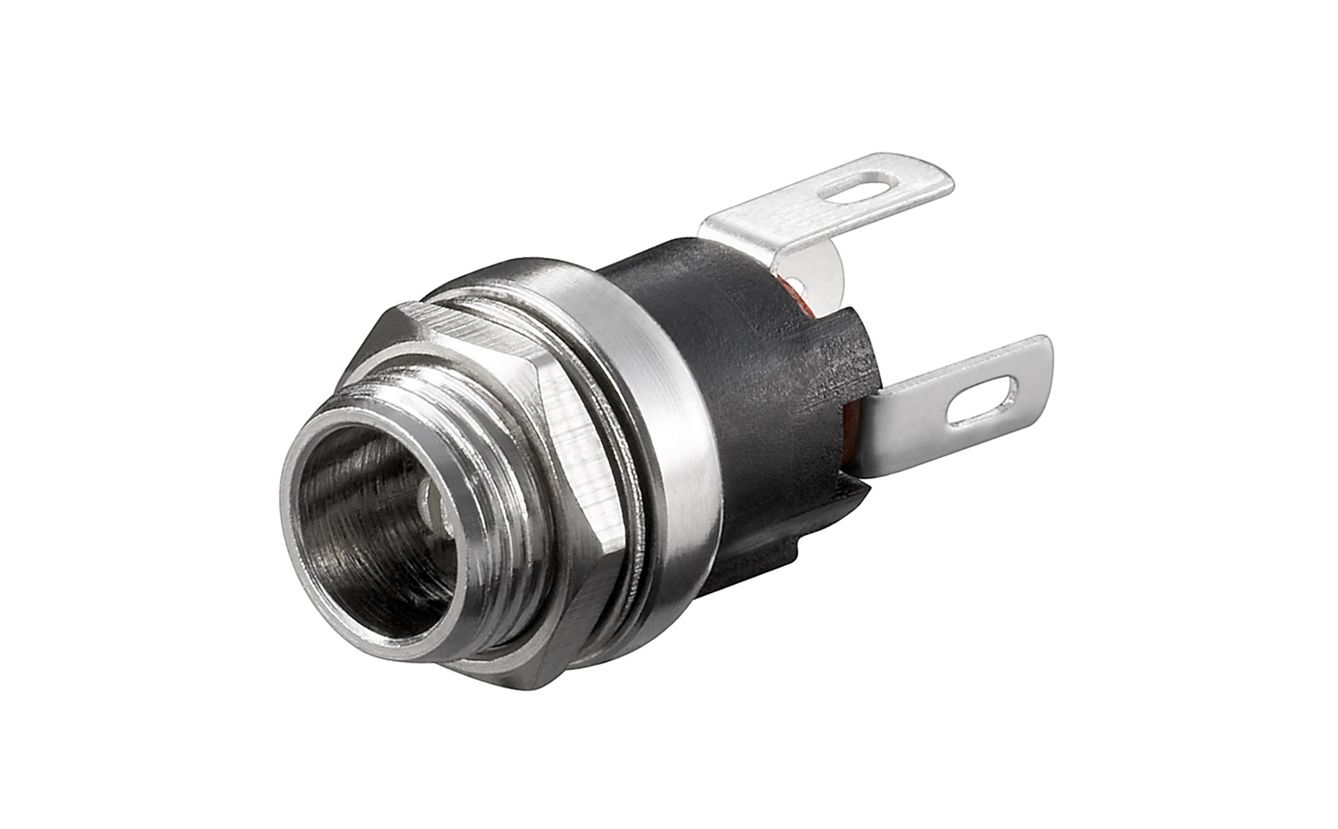 DC-Einbaubuchse Stift 2,5 mm, geschlossene Bauart mit Lötanschluss. Zum Konfektionieren eines Kabels von individueller Länge oder zum Ersetzen einer defekten Einbau-Hohlbuchse 3-polige DC-Buchse findet Verwendung im AV-Bereich, bei elektronischen Haushaltsgeräten und Multimedia-Anwendungen. Geeignet zum Einbau in Gehäuse von Audio- und Videogeräten, Kameras, Fernsehern, elektronischen Waagen, Fitnessgeräten etc. Mit Unterlegscheibe und Sechskantmutter zur sicheren Befestigung des angeschlossenen Gehäuses Anschluss der DC-Kupplung erfordert Lötmontage.