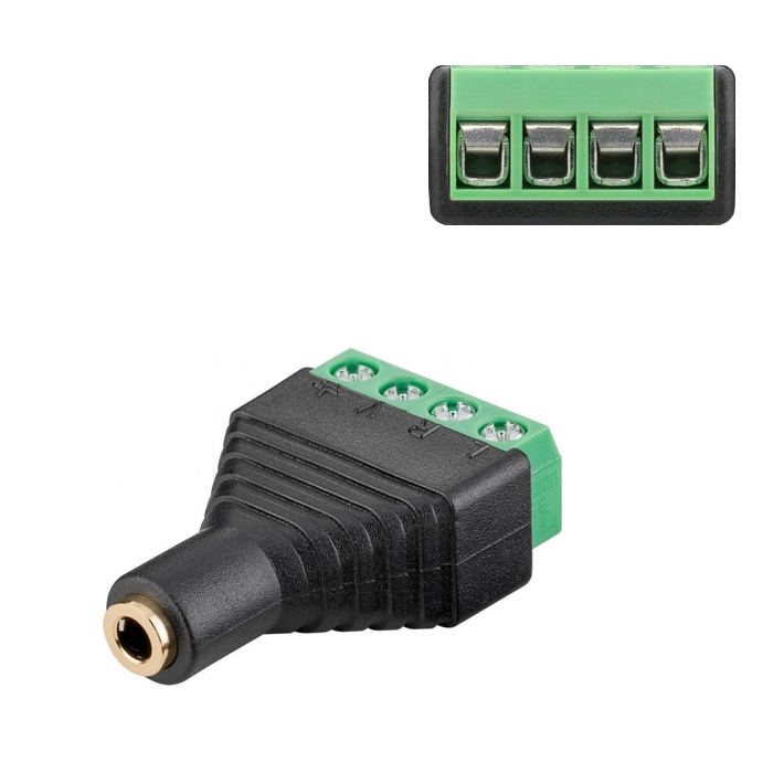 Schraubbefestigung für die schnelle Verdrahtung mit abisolierten Kabelenden einsetzbar im Hobbybereich, in der Alarmtechnik, im AV-Bereich oder bei Testaufbauten Kontaktierung: Audio (links/rechts),Video, Masse Kontaktabstände: 5 mm Terminal Block 4-pin > Klinke 3,5 mm Buchse 4-Pin, stereo, vergoldet