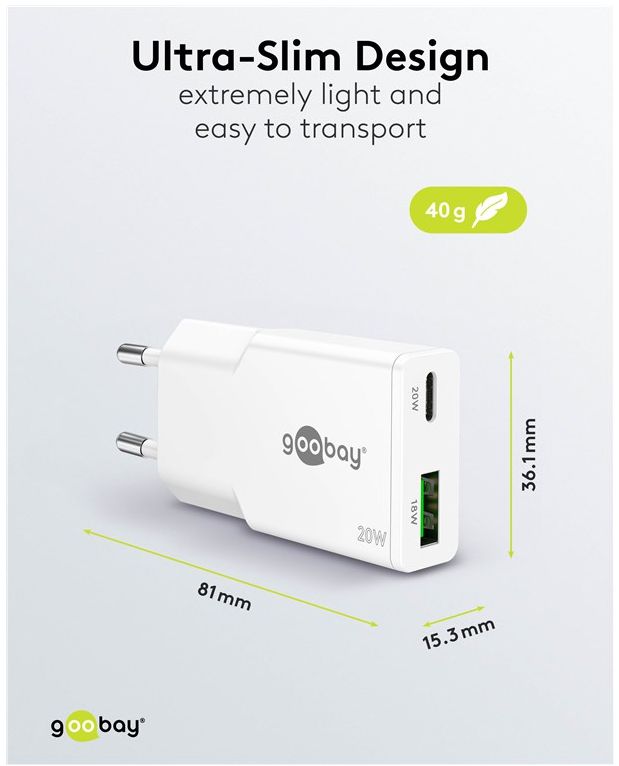 Mit der Slim-Reihe liefert Goobay ein superflaches Charger-Design ab. Speziell zugeschnitten auf die Bedürfnisse von Reisenden, passt das schlanke USB-Netzteil in jede Tasche und jedes Gepäckstück. Die perfekte Energielösung für Smartphone, Tablet oder Smartwatch, unterwegs und auf Reisen. Charge, eat, sleep, repeat!