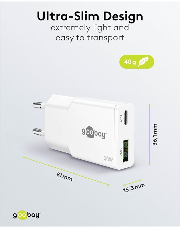 Mit der Slim-Reihe liefert Goobay ein superflaches Charger-Design ab. Speziell zugeschnitten auf die Bedürfnisse von Reisenden, passt das schlanke USB-Netzteil in jede Tasche und jedes Gepäckstück. Die perfekte Energielösung für Smartphone, Tablet oder Smartwatch, unterwegs und auf Reisen. Charge, eat, sleep, repeat!