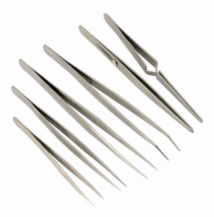 Hochwertige, sehr sauber gearbeitete und exakt schließende Pinzetten aus rostfreiem Federstahl (nicht magnetisch!). Ideal für Labor, Hobby, Werkstatt, Modellbau, Elektronik usw. Verschiedene Längen von 120...180 mm (je nach Ausführung).Lieferumfang: 3x Spitzpinzette Spitze gerade 1x Spitzpinzette Spitze gebogen 1x Pinzette Spitze gerade mit Schubarretierung 1x Kreuzpinzette Spitze gerade