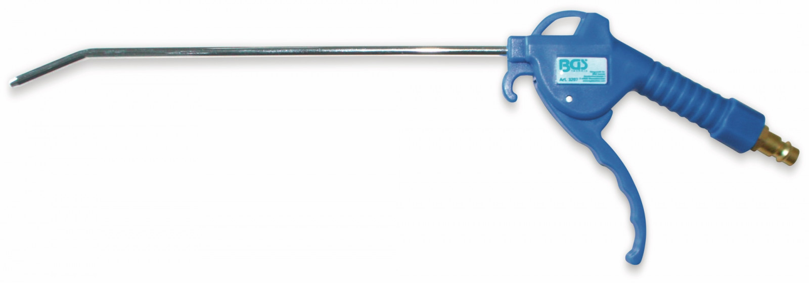 Druckluft-Ausblaspistole in Werkstattqualität mit nahtlosem, verchromtem Stahlrohr und Griff aus blauem Nylon-Fiberglas. Passend für alle handelsüblichen Kompressoren.