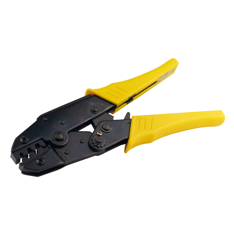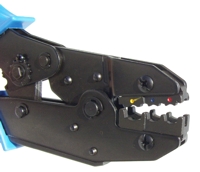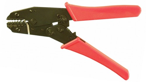 Crimpzange für unisolierte Kabelschuhe von 0,5 bis zu 6 mm² (0,5 - 1 / 1 - 2,5 / 4 - 6 mm²). Ratschenmechanik mit Krafteinstellung und Entriegelung. Ergonomisch geformter Griff für leichte Bedienung.