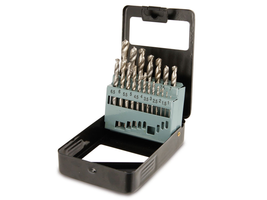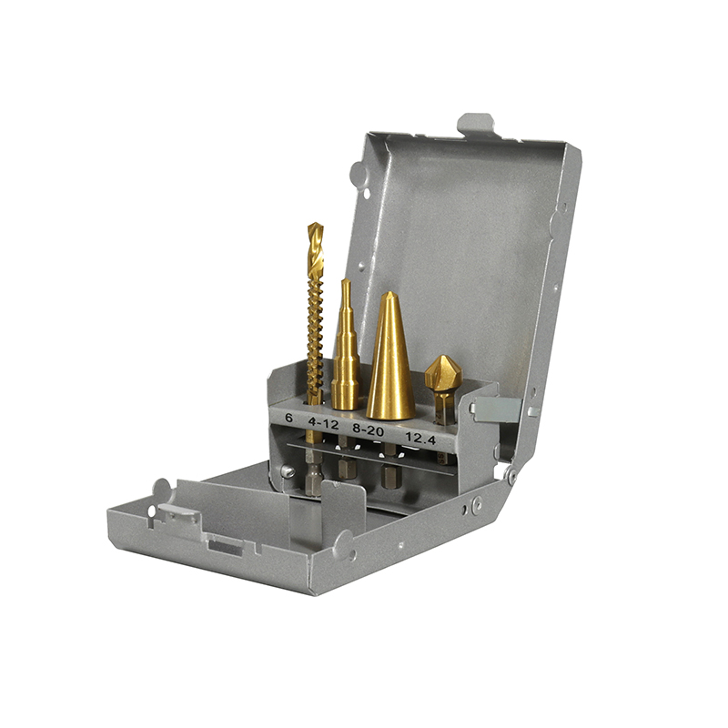 Bestehend aus einem Fräsbohrer Durchmesser 6 mm, einem Stufenbohrer 4 - 12 mm, einem Schälbohrer 8 - 20 mm und einem Kegelsenker 4 - 12,4 mm.
