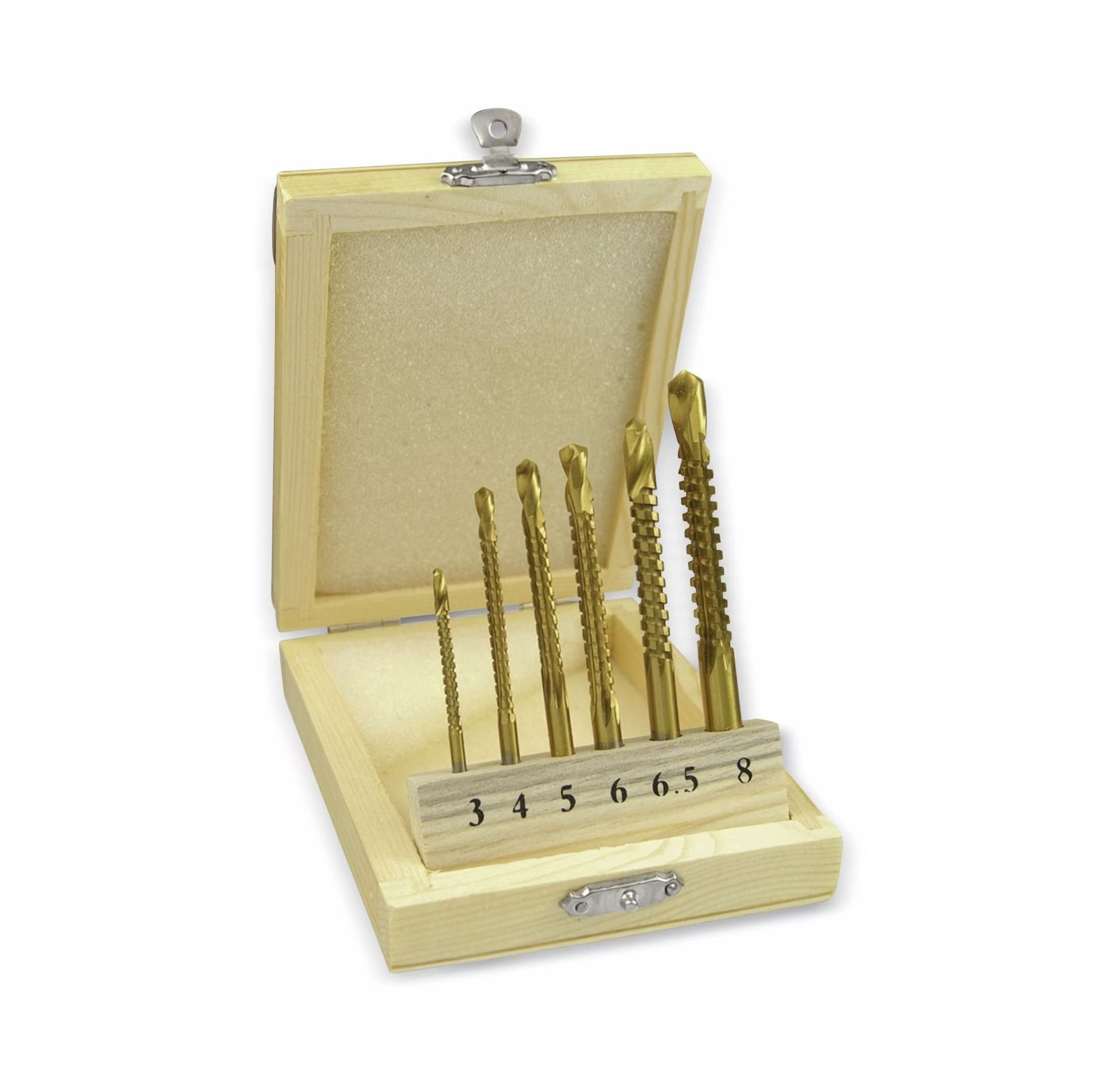 6-teiliger Fräsbohrer-Satz aus HSS, titanbeschichtet, in praktischer Holzkassette.Top-Features: 6-teiliger Fräsbohrer-Satz aus HSS Titanbeschichtet für lange Haltbarkeit Größen: 3-4-5-6-6,5-8 mm Praktische Holzkassette Ideal für Heimwerker und Profis