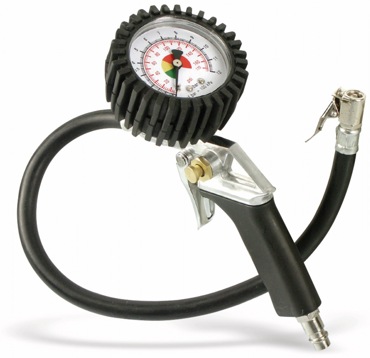 Robuste Druckluft-Pistole zum Befüllen von Autoreifen, Fahrradreifen usw. Manometer ø 60 mm mit Gummischutz. Arbeitsdruck 0...12 bar. Druckluft-Steckanschluß. Schlauchlänge 400 mm.