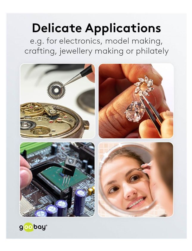 Die Pinzetten sind der perfekte Helfer für alle Präzisionsarbeiten, vom Modellbau bis zur Philatelie. Durch die vielseitigen Formen ist für alle Einsatzzwecke stets die richtige Pinzette griffbereit.