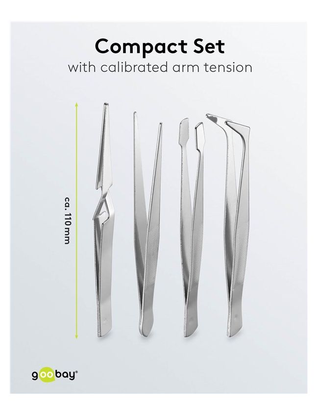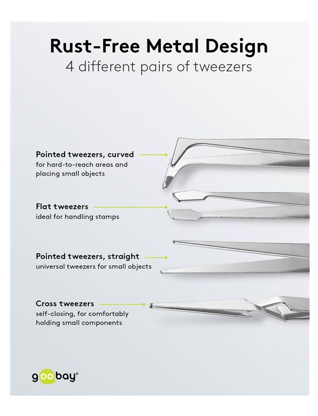 - Inkl. 1x Spitzpinzette, gerade, 1x Spitzpinzette, gebogen, 1x Flachpinzette (Briefmarkenpinzette), 1x Kreuzpinzette
